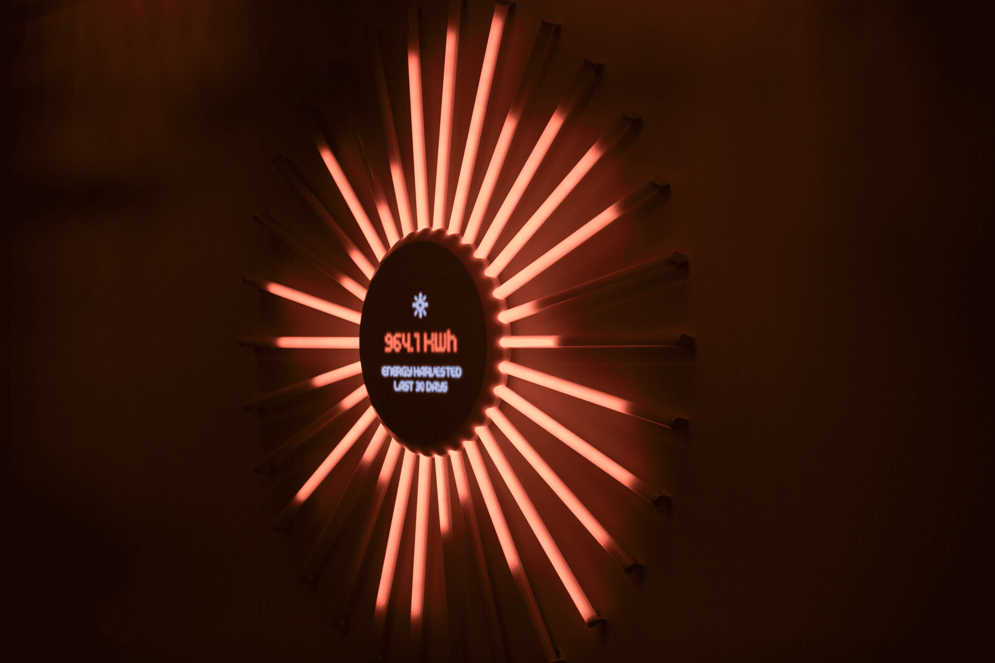 Create a circular light source that sends light beams outwards and clockwise as the day progresses—showing the live solar energy that is harvested. In the center, a second smaller circle of lights represent energy used. The installation will cycle through to showcase live data in-the-moment, and aggregate monthly and yearly totals.